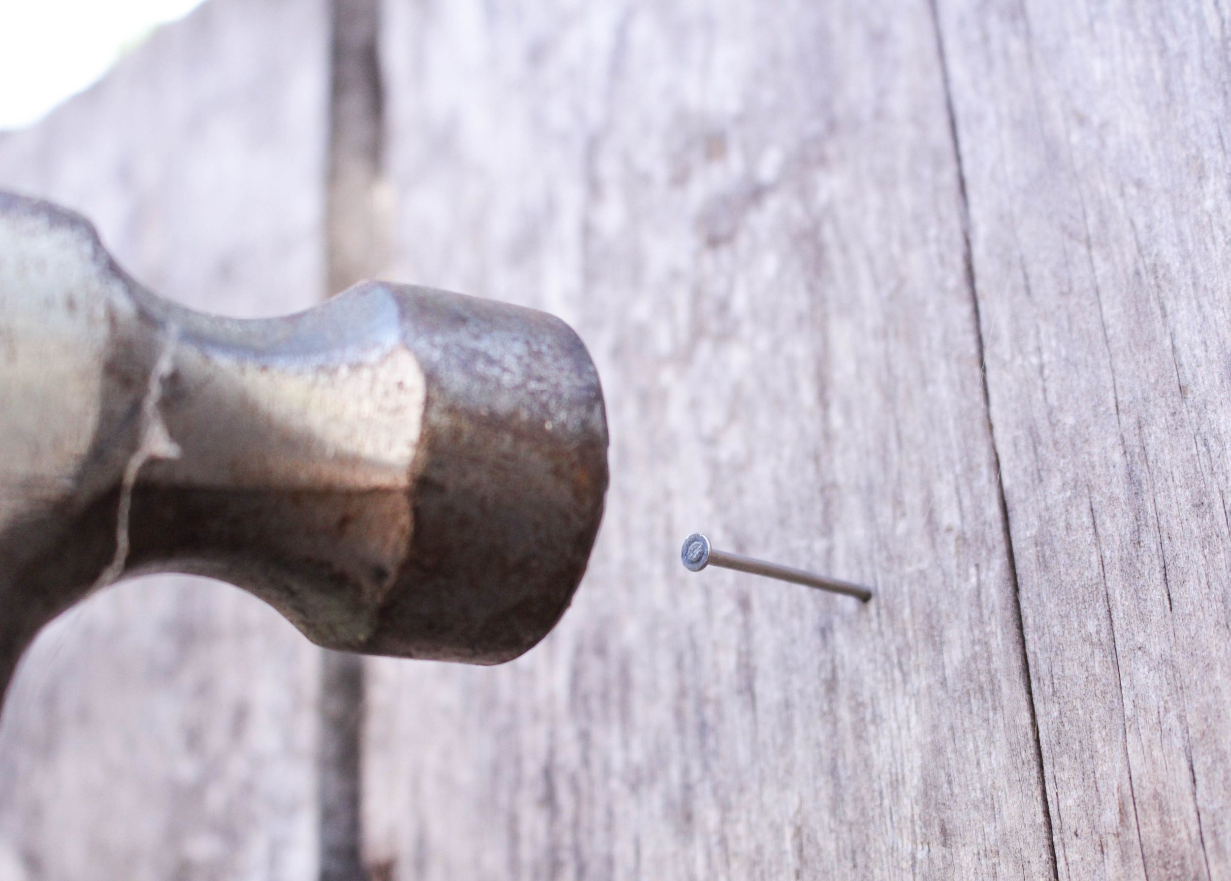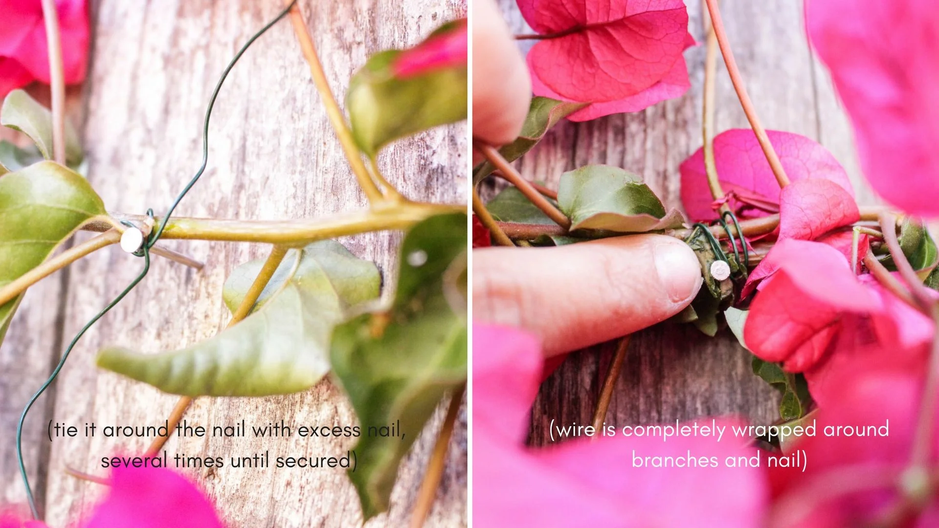 Step 4. Take the 2 branches wrapped together to the nail on the fence and continue wrapping the wire around the nail and the branches. Continue until it is secured and you have no more wire left.