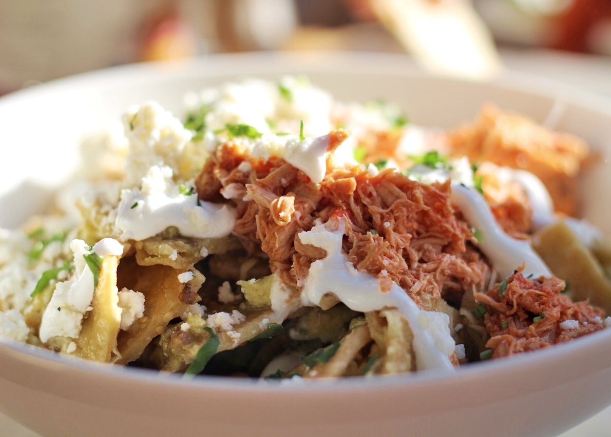 - Chilaquiles with tortilla chips, salsa verde, black beans, scrambled egg, sour cream, and queso fresco