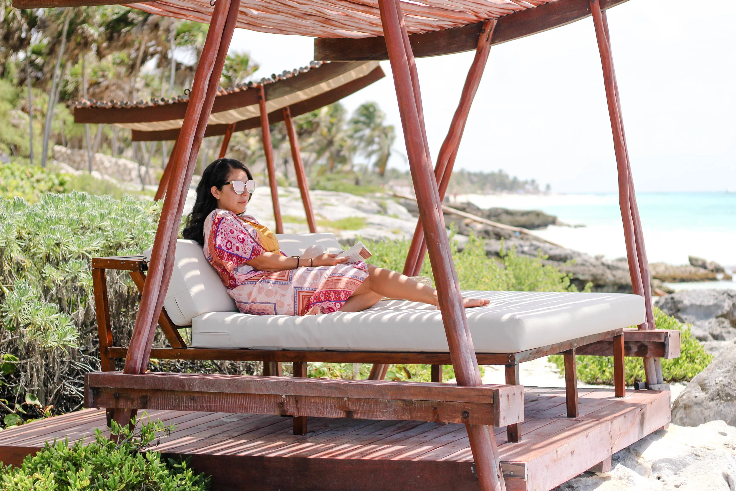 We always knew we wanted to return to Tulum after visiting for the first time, with the boys, two years ago. So this year, Adam whisked me away to explore the little pueblito of Tulum just the two of us. It's location is about 2 hours south of Cancun. It is quaint, isn't congested with tourists, laid back and it has a bohemian feel to it. You ride on bikes to get around and pretty much live in your swim suits. Even though it was just a 5 day getaway, we were able to enjoy many activities and relax at the same time. If you're a parent, you know relaxing can be as easy as sitting on the plane for 5 hours, without any interruptions and just reading a magazine.